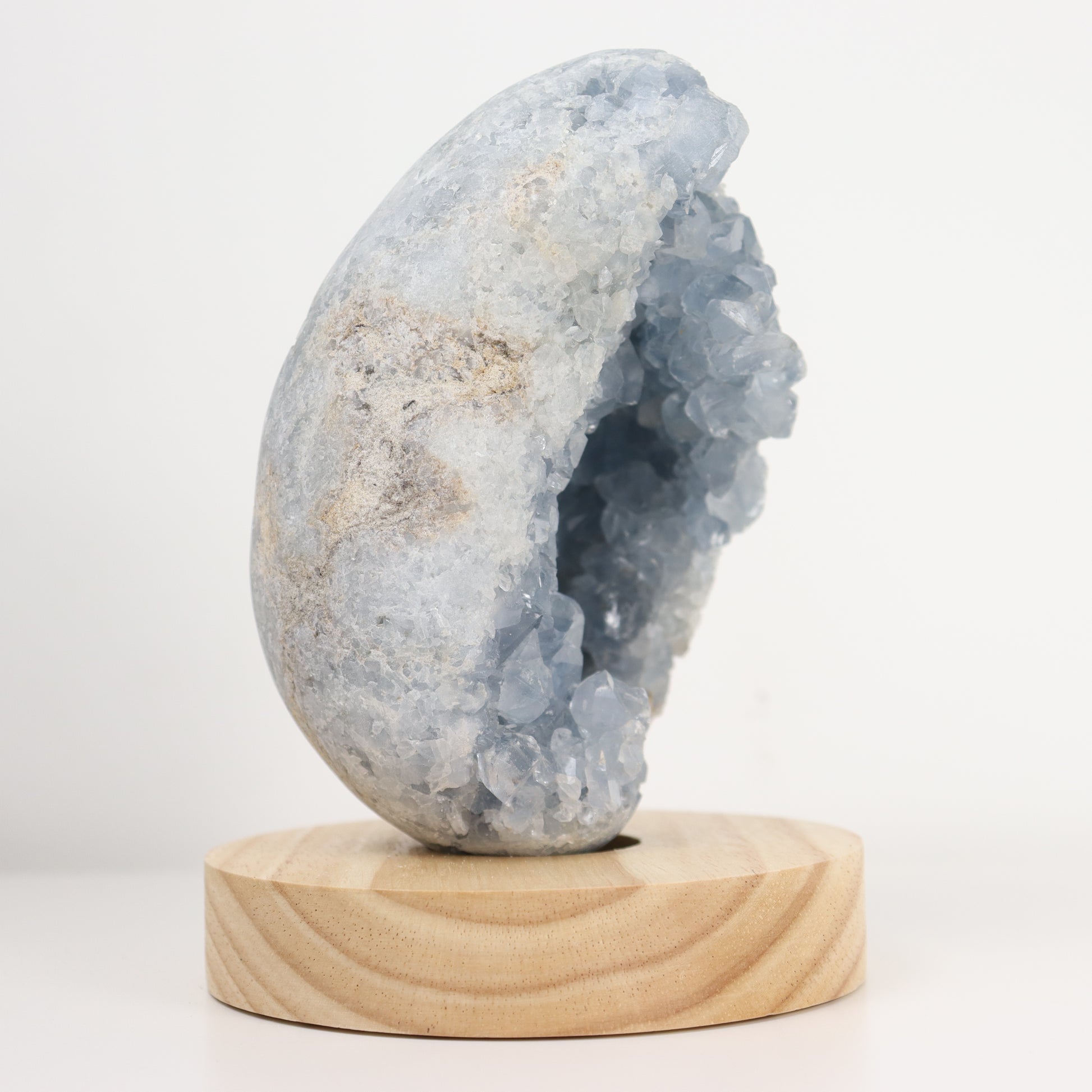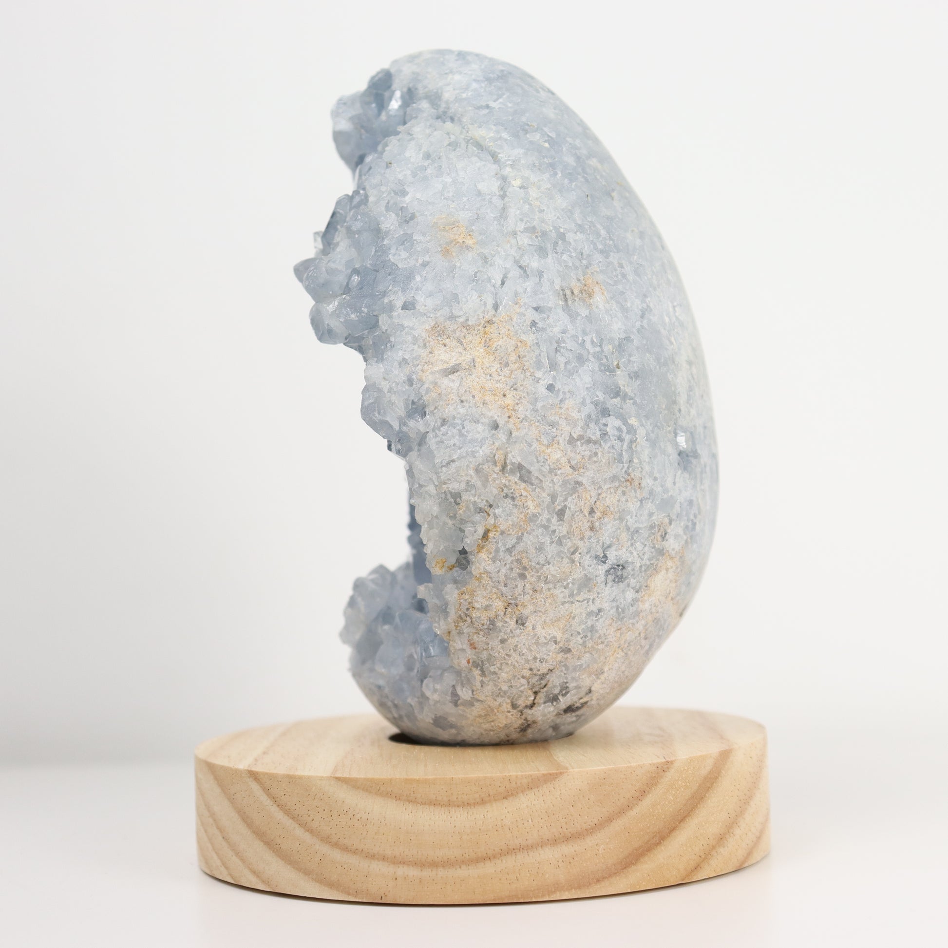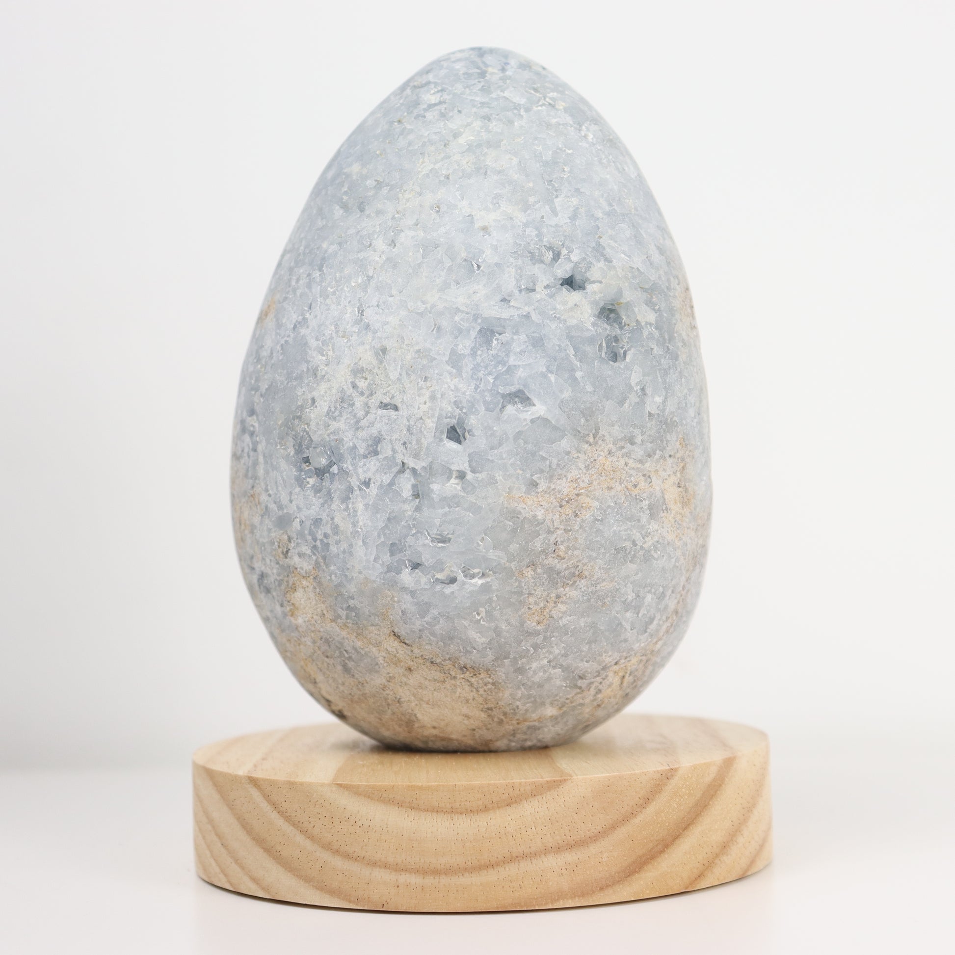 Hand-selected for its exceptional quality, each Celestite egg boasts a harmonious blend of calming blue hues and intricate crystal formations. The semi-polished surface adds a touch of elegance, allowing the natural brilliance of the crystal to shine through while maintaining a tactile and smooth finish.