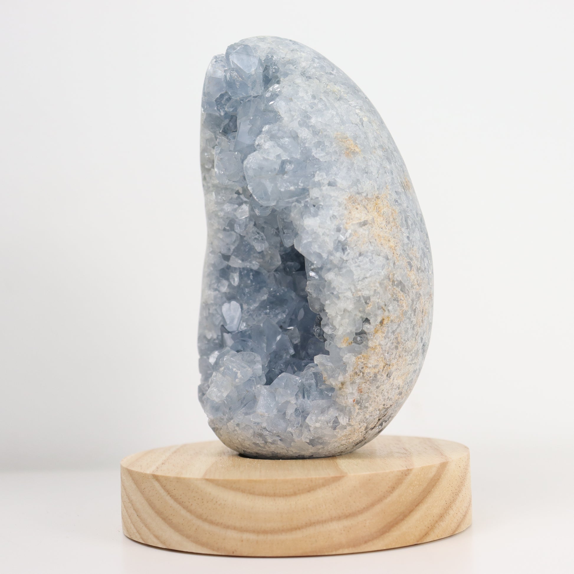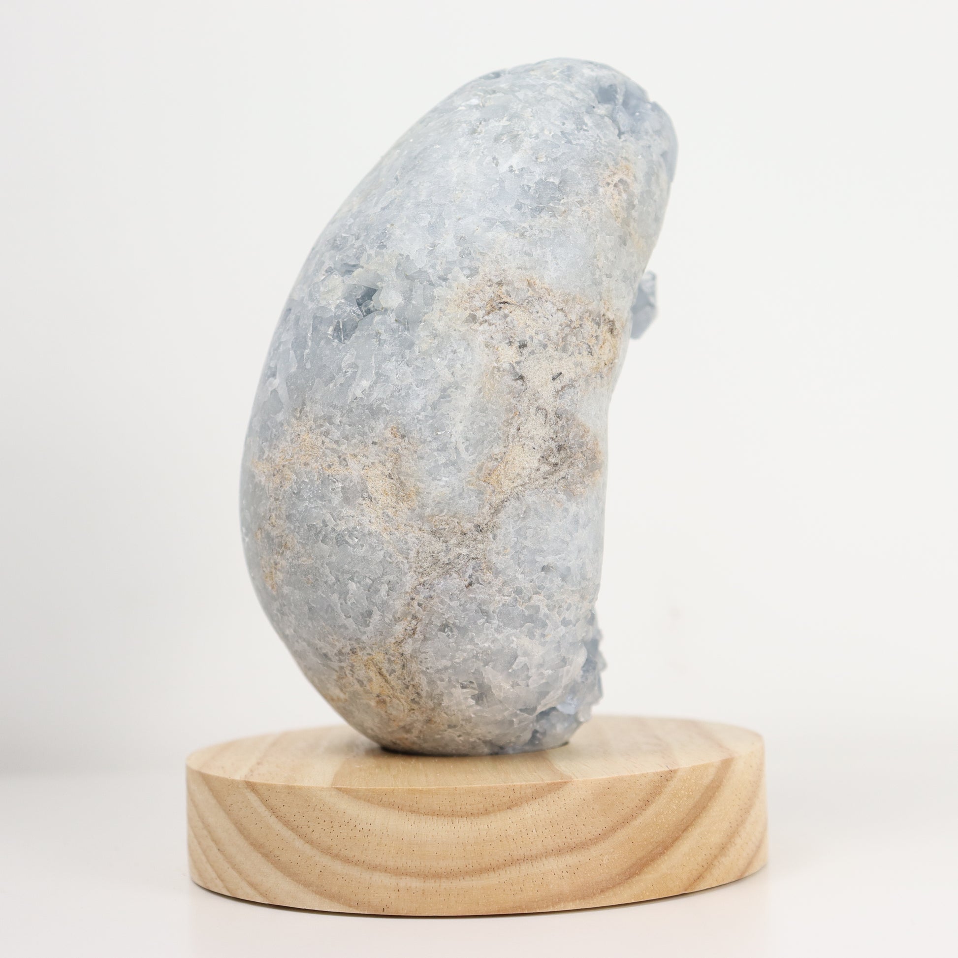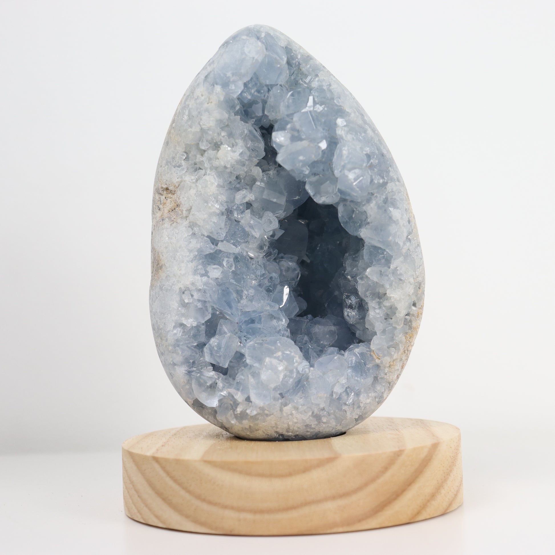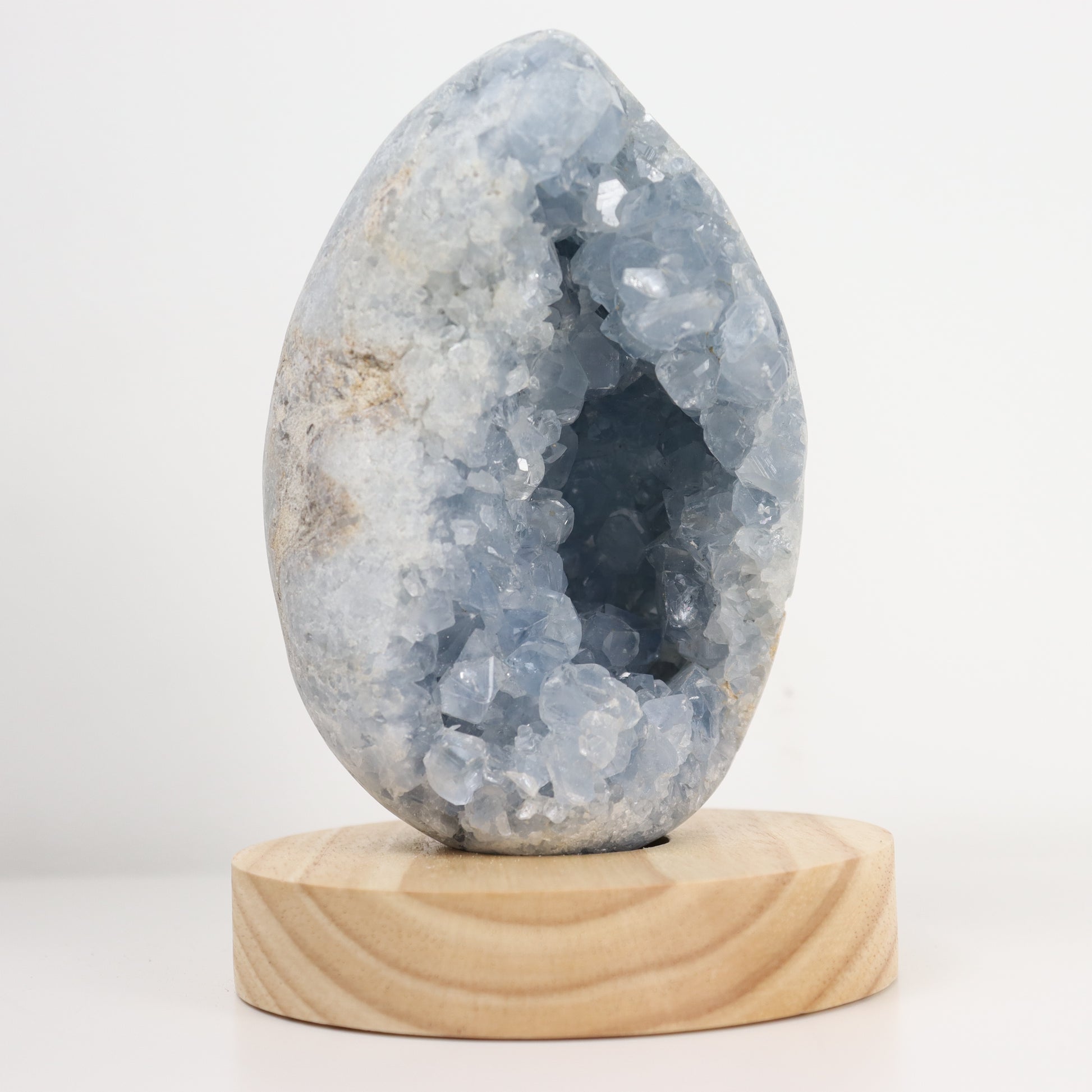 Hand-selected for its exceptional quality, each Celestite egg boasts a harmonious blend of calming blue hues and intricate crystal formations. The semi-polished surface adds a touch of elegance, allowing the natural brilliance of the crystal to shine through while maintaining a tactile and smooth finish.