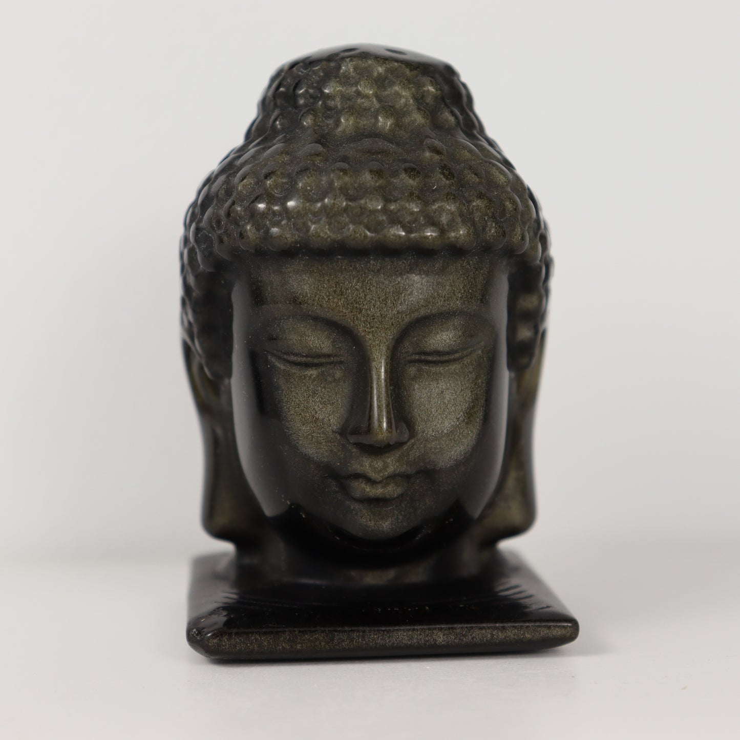 Crafted from the precious and rare golden obsidian, this Buddha head carving gleams with a unique shimmering beauty. Golden obsidian is revered for its golden sheen and is associated with protection, spiritual growth, and self-reflection.