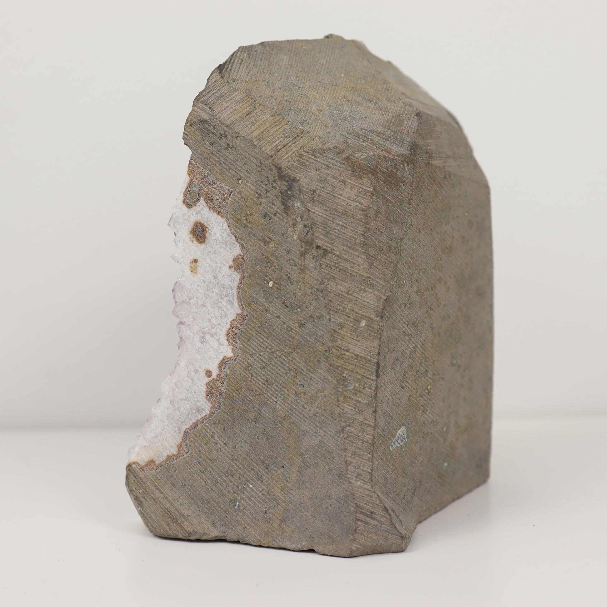 This cluster reveals a fascinating geode structure, where the rough exterior conceals the crystalline treasures within. Break open the grey geode to uncover a hidden world of glistening, delicate amethyst crystals that add a touch of mystery and intrigue.