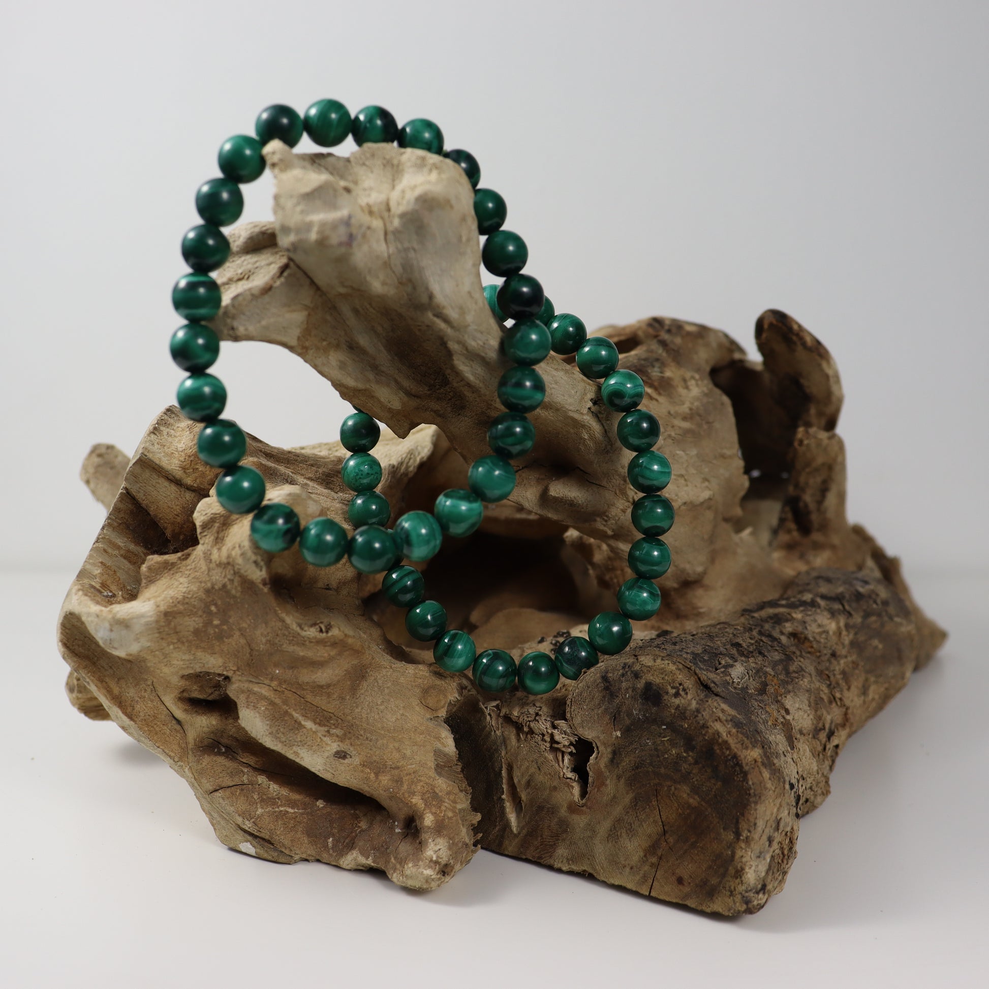 hues and distinctive banding patterns. Crafted with care and precision, each 8mm bead in this bracelet is a testament to the natural wonder and spiritual significance of malachite.