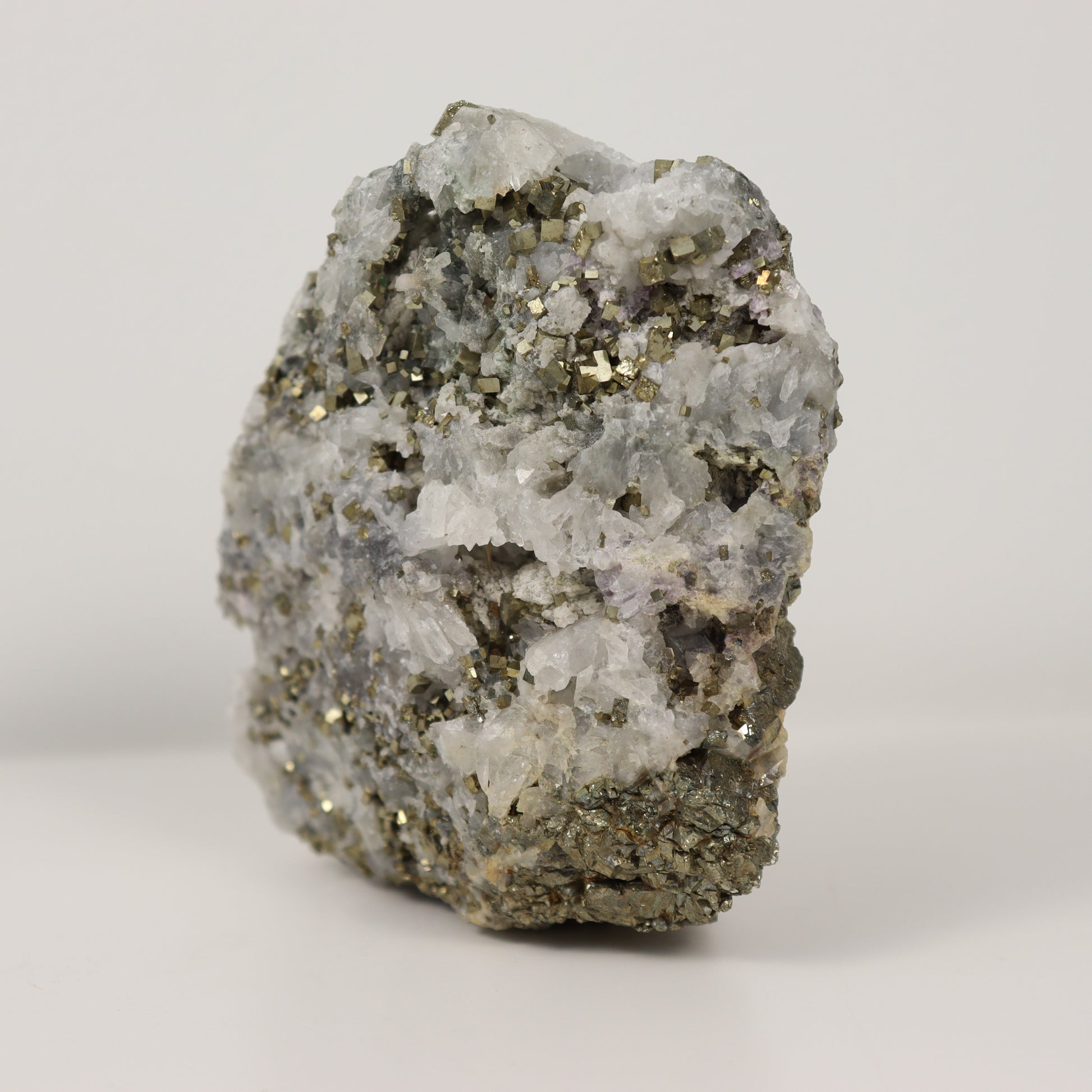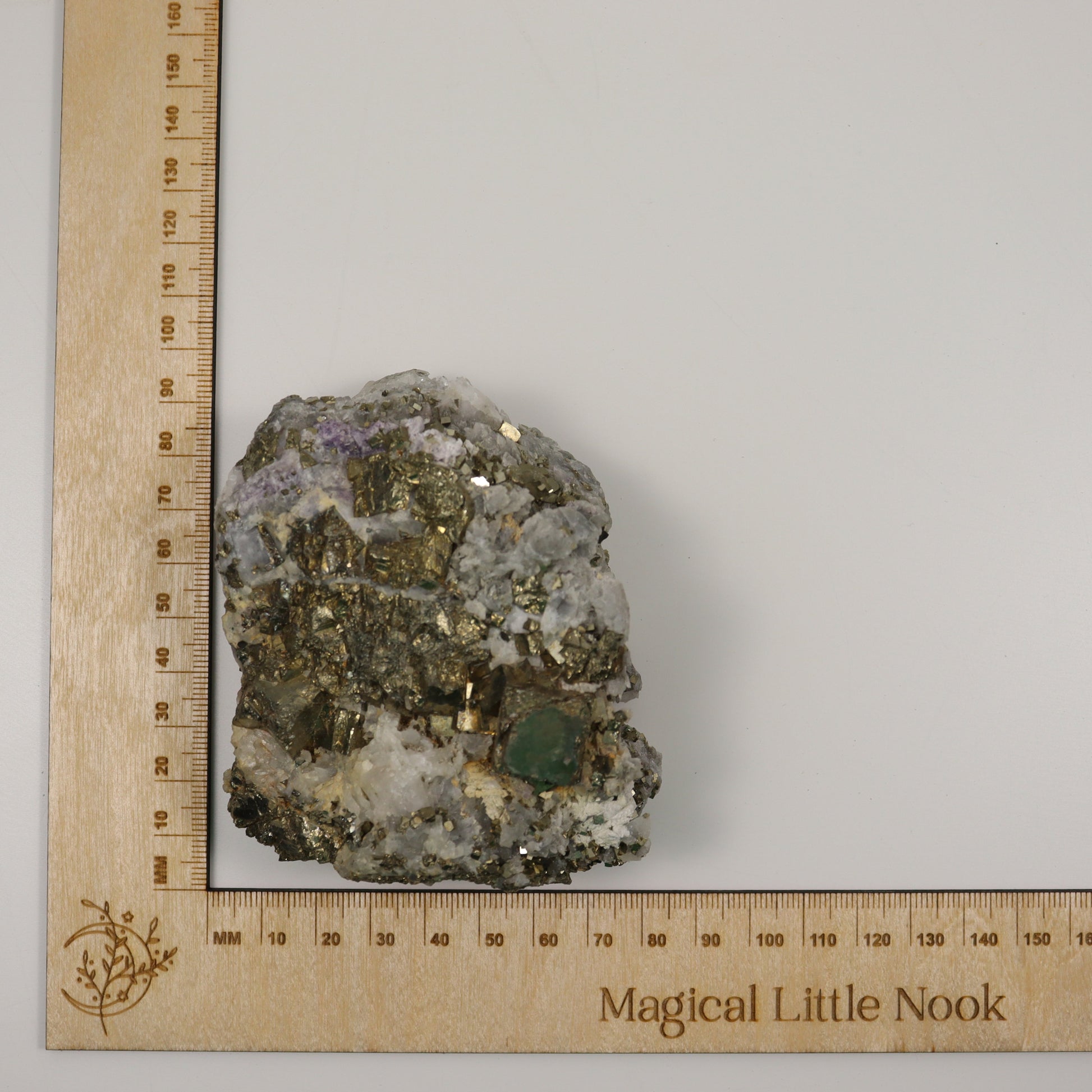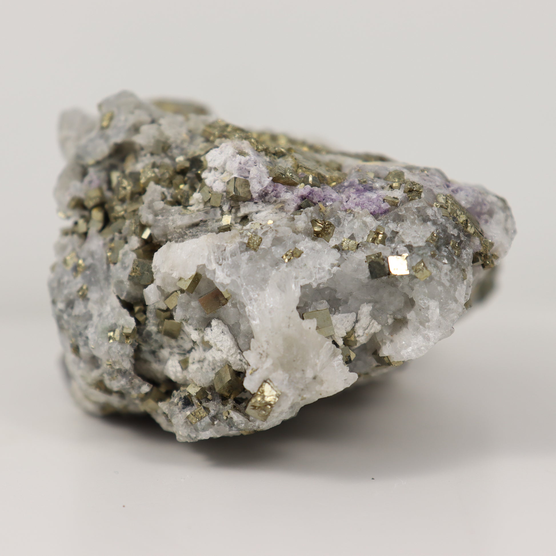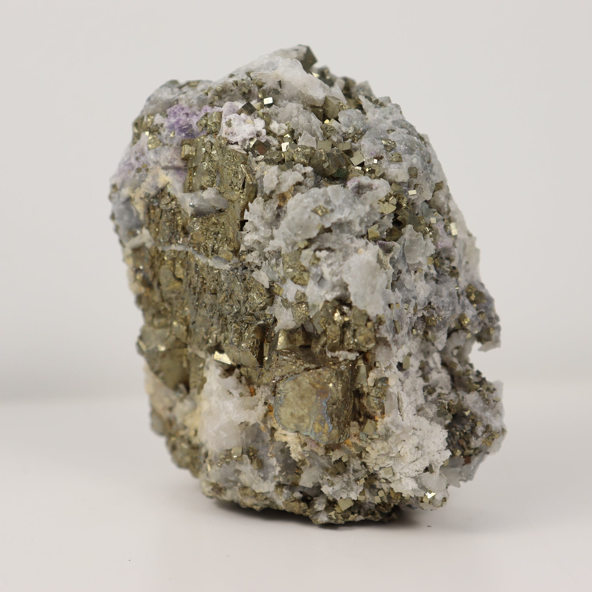 Nestled within the pyrite formation, you'll discover the gentle presence of amethyst crystals. With its soothing purple tones, amethyst is associated with tranquility, spiritual growth, and enhanced intuition.