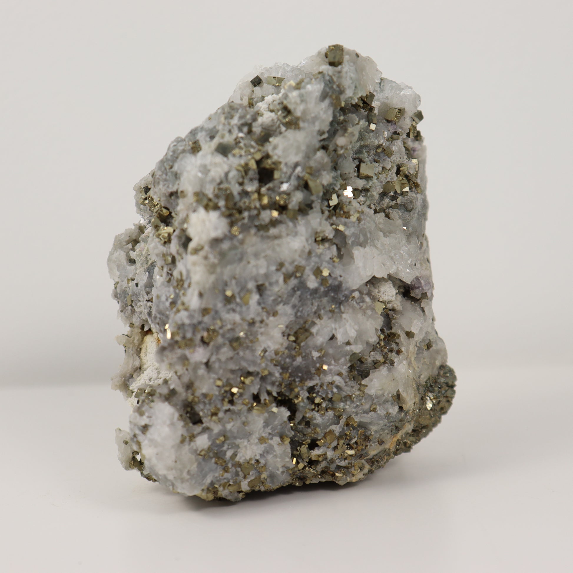 Unearth the enchanting world of minerals with our Pyrite Specimen, featuring captivating Amethyst and Clear Quartz inclusions, adorned with iron residue. This stunning piece is a testament to the Earth's artistry, showcasing a harmonious blend of textures, colors, and energy.