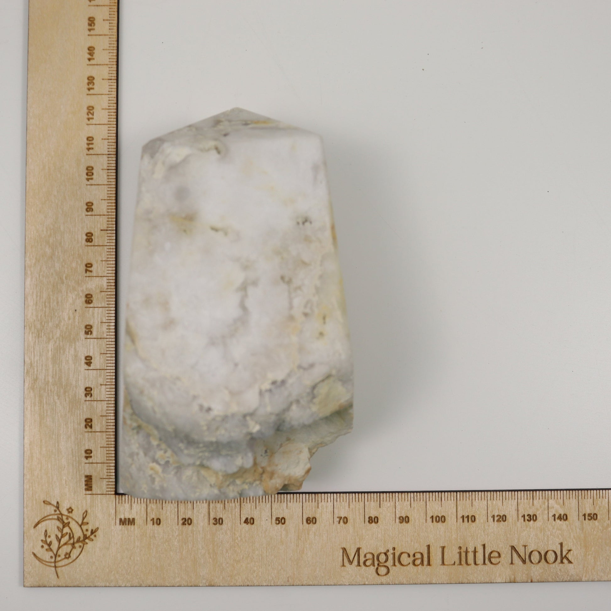 Whether used as an elegant centerpiece on your altar, a focal point in your living space, or a conversation starter in your office, this White Agate Druzy Pillar adds an element of sophistication and natural beauty to any setting. It